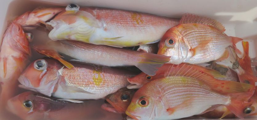 鬼カサゴ狙いで出船しました。強風も収まり上凪に成りましたが肝心の潮が悪く、朝内は少し風があったので移動しましたが底潮が止まって居るので根篝多く大変でしたが、何とか土産をキープ出来ました。明日、アマダイを釣りに来るので下見に行ったら良型混じりで釣れました