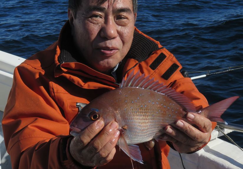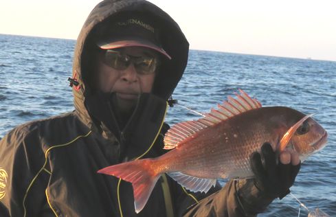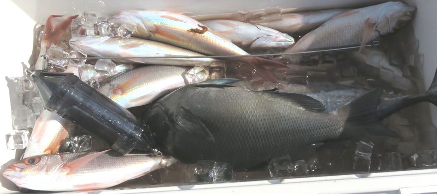 水温 20.3度 海上 北西の風 潮動かず おもり80号 ハリス 6号 6m 2本 針 マダイ チカメキントキ 大サバ オウモンハタ レンコダイ オバサン 尾長グレ キメジウマズラハギ シキシマハナダイ でした