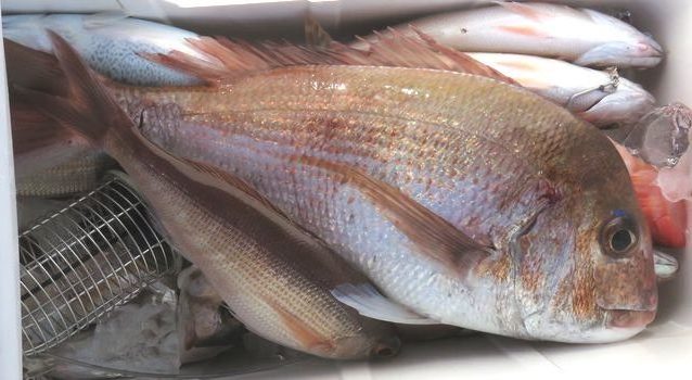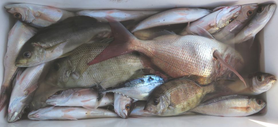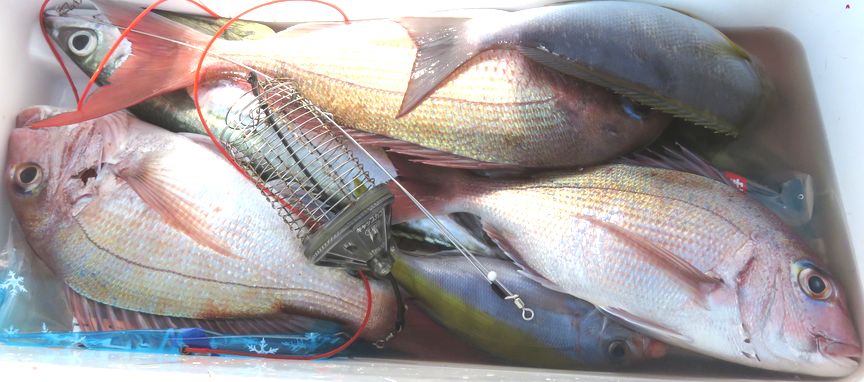 マダイ五目で出船しました。昨日帰りに寄った時は一隻も居なかったのに今日は凪も良いので沢山の船が集まっていて、二枚潮で大サバが釣れて横走りして絡んで大変でした。底潮が止まっているので当たるのはハタ系とオバサンばかりで近くにいた僚船に様子を聞いたらマダイとキハダが釣れたと言うので期待していたら前から順に当り出し何とか土産をキープ出来ました