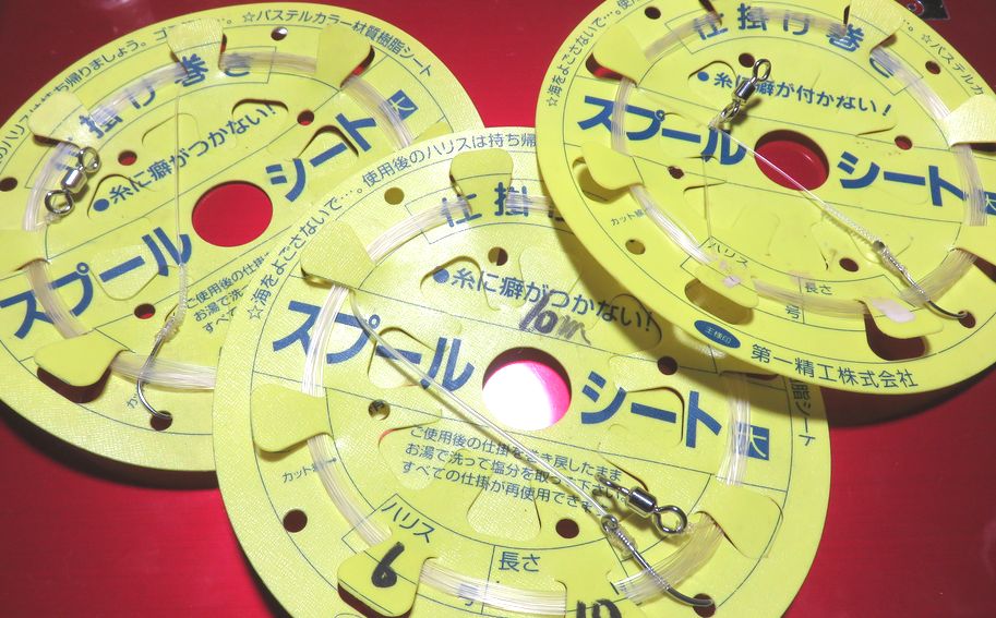 キハダマグロの仕掛けを作って欲しいと頼まれて雨で暇して居たので作って見ました。3本用意して2本はチモトを編み込んで補強しもう一本はケイムラパイプを坂本結びで固定しました