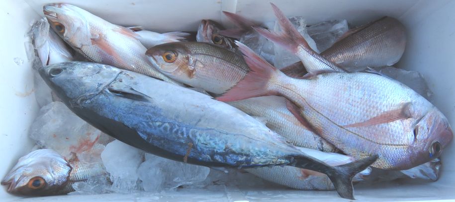 水温 19.8度 海上 北東の風 真潮ぎみ おもり80号 ハリス 6号~10号 6m 2本針 マダイ ハマチ イサギ サバ シイラ ウメイロ オウモンハタ ソマカツオ でした