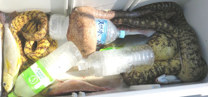 クエを狙って出船しました。凪良く昨日ぶっ飛びだった潮も少し収まり生きエサを釣りながら初めは冷凍のスボタで狙いましたが当りは出るもののウツボばかりで最初は小さかったですが段々大きく成り、最後のエサまで巨大ウツボでやっと釣れた活エサには当たりませんでした。 クエを狙う時はウツボの居るところを狙い、クエが回って来るとウツボは居なくなると