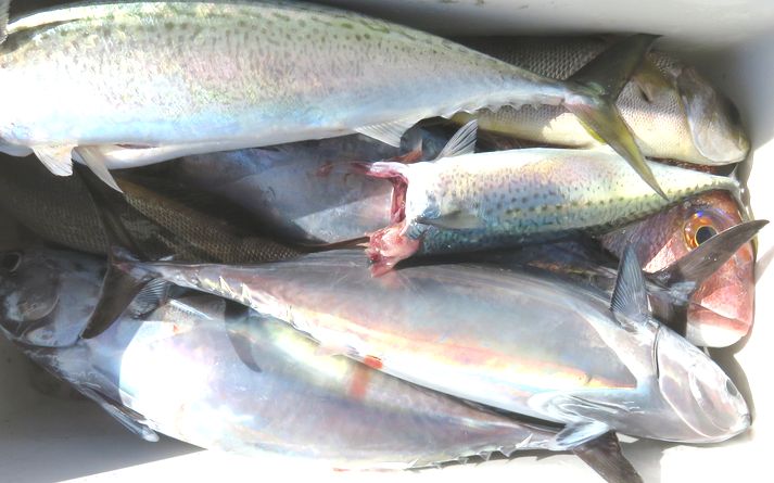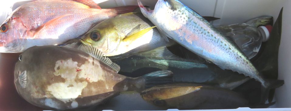 マダイ五目で出船しました。凪良く潮は流れて無かったですが直ぐに当りは出て最初はイサギばかりでしたがナブラが沢山出て来たら青物が回って来て何度か切られてしまいましたがボチボチ釣れてまずまずの釣果に成りました。