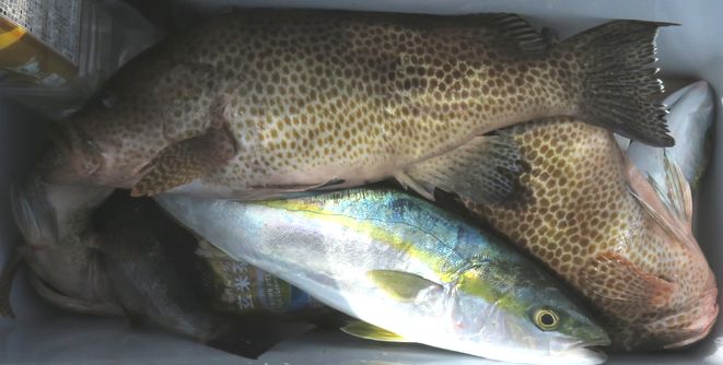 マダイ五目で出船しました。前回良く釣れたポイントに着くと潮が止まっていて、釣れるのはオウモンハタのみで諦めて沖に移動したら、当りが出だし大ソマと青物のなぶらが回って来て横走りするので大変でしたがボツボツ釣れて、何とか土産をキープ出来ました。