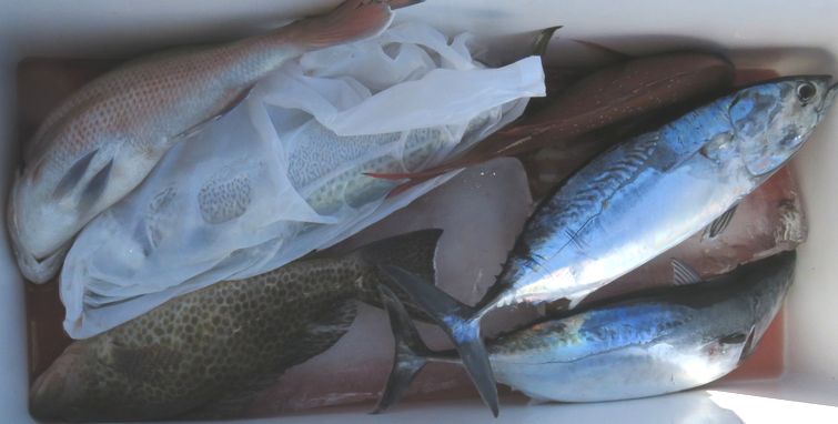 水温21.1度 海上 北西の風 大うねり 底潮 おもり80号 ハリス10~30号 5m 1本針キハダマグロ 太ソマカツオ シイラ サバ でした