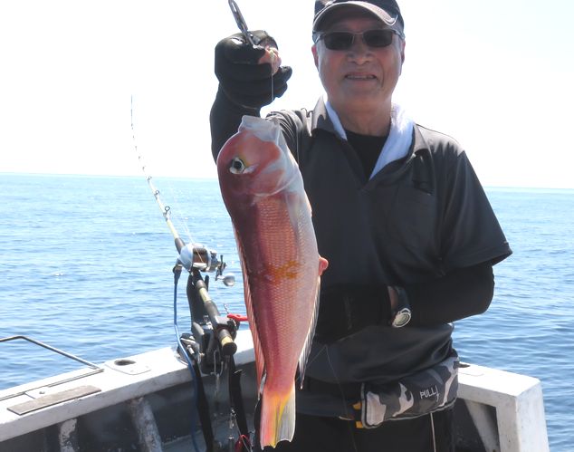 中深海五目で出船しました。風弱く小雨が降る予報でしたが風波が有りカンカン照りでした。東の風でしたが潮が速くあっという間に東に流されて何度も戻ってを繰り返しましたが諦めて土産の甘ダイ釣りに変更し、キャバレー天秤初挑戦でしたが喰わせ針に良型が掛かり、強烈な引きを味わって何とか土産をキープ出来ました。