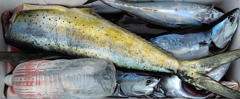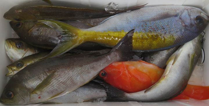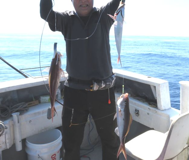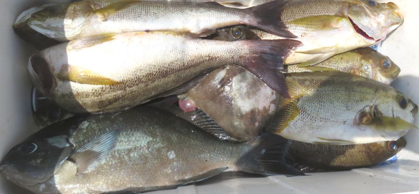 イサギ五目で出船しました。凪良く潮も良く流れて居てボチボチ当りが出ましたが、シイラが回って来て仕掛けが落ちて行かず大変でしたので浅場へ移動したら魚種多種でしたが、ウツボ縄を掛けに来たので戻りましたが反応は良く出ていましたが今一でした。