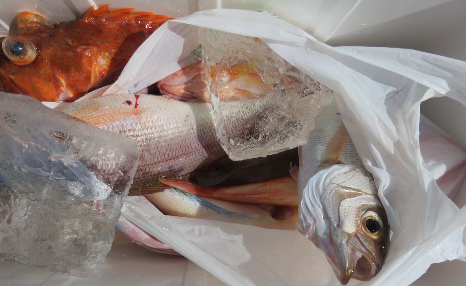 水温 28.3度 海上 北東の風 真潮 おもり 150~240号 キャバレー天秤使用 エサ カツオの腹も ホタルイカ 朝日屋のトントロ 鬼カサゴ カサゴ 赤イサギ でした