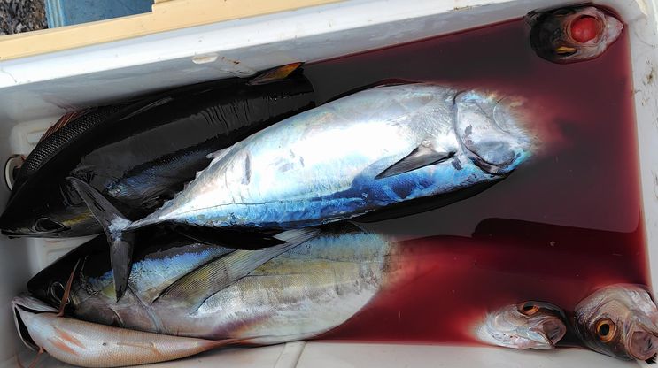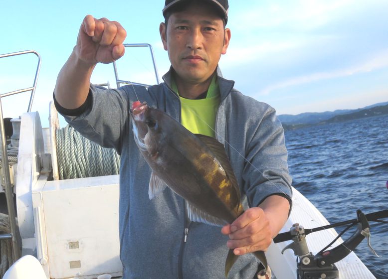 ウメイロ五目で出船、風が有り潮も流れて居て直ぐに本命の当りが出ました。ボチボチ釣れましたが、急に当りが止まり棚が上がったり下がったりで今度はイサギが当り出したと思ったら強烈な青物の当りが何度も出てイサギの仕掛けでは歯が立たず8号が有ったので変えましたが変わらず、沖から僚船が中カツオにヤイトメジマグロツムブリが釣れたと連絡が有りました。
