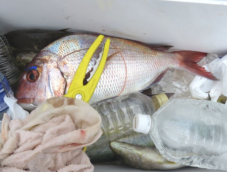 水温 25.6度 海上 北東の風 真潮 おもり 80号 ハリス 5号 6m 2本針伊勢尼12号 ウメイロ イサギ マダイ アカハタ シイラ オバサン ハコフグ ムロアジ でした
