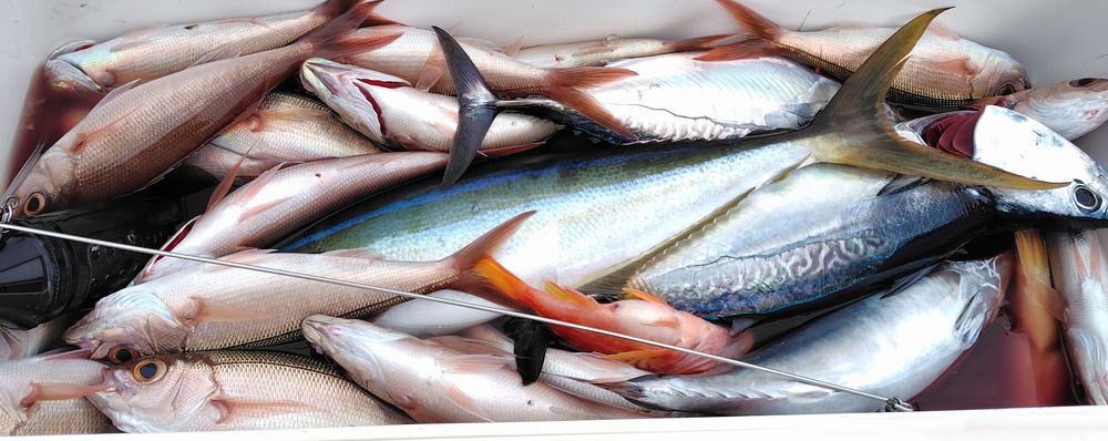 マダイ青物狙いで出船しました。ポイント沖に巻き網船が居て嫌な予感がしましたが案の定マダイの顔は見えず釣れるのは春より大きく成ったヒメダイばかりである程度釣れたのでウメイロでもと思ったら強烈な当りが出てツムブリが上がりキハダや青物が回って来たので太ハリスに変えて暫く入れ食いに成り太ハリスでも何度も切られましたがまずまずの釣果に成りました